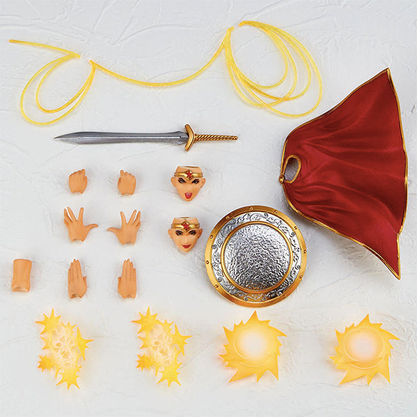 - Red and blue coloring and gold decoration are also dazzling. In the comic version costume, a cloak shaped with a realistic figure fluttering in the wind is also made with separate parts. It also comes with a wealth of weapon parts such as metallic swords and shields, and the "True Lasso" that can be held in both hands.
