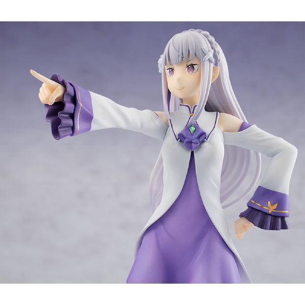 The famous scene of Emilia confronting Echidna following the graveyard trials has been faithfully captured in figure form. Fans are sure to remember Emilia's unperturbed expression as she confidently introduced herself, shortly after being called a "loose woman" by Echidna. The figure comes with two face parts—a confident expression and a smiling expression—that both look great with her pointing pose. Enjoy Emilia's cool and cute looks with new resolve in her heart!