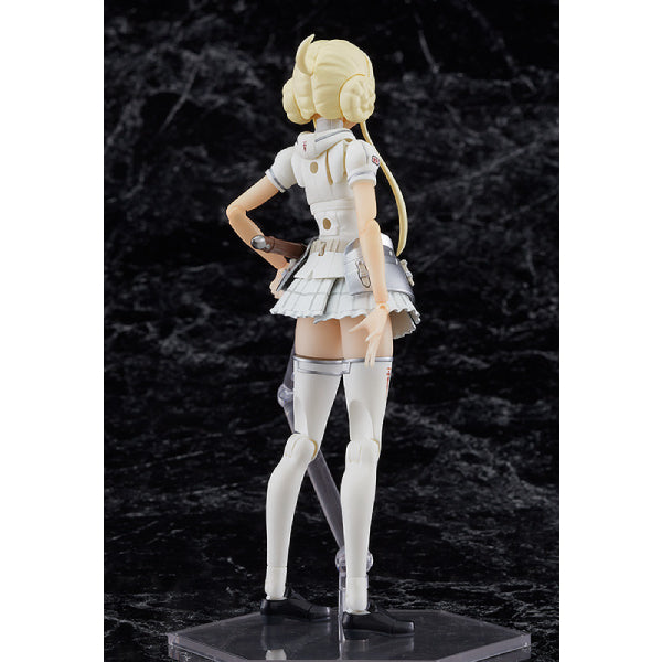 The snap-fit model is based on an original design by Akiman carefully brought into model form by Max Factory. Three pre-painted face plates—a standard face, a shouting face and a face with closed eyes—are included. An unpainted face plate and eye decals are included as well. Her uniquely designed apron is created with pre-painted PVC parts, and she comes with two different front skirt parts of varying width for different situations. Her skirt is also articulated, allowing for unobstructed movement of her legs for posing.