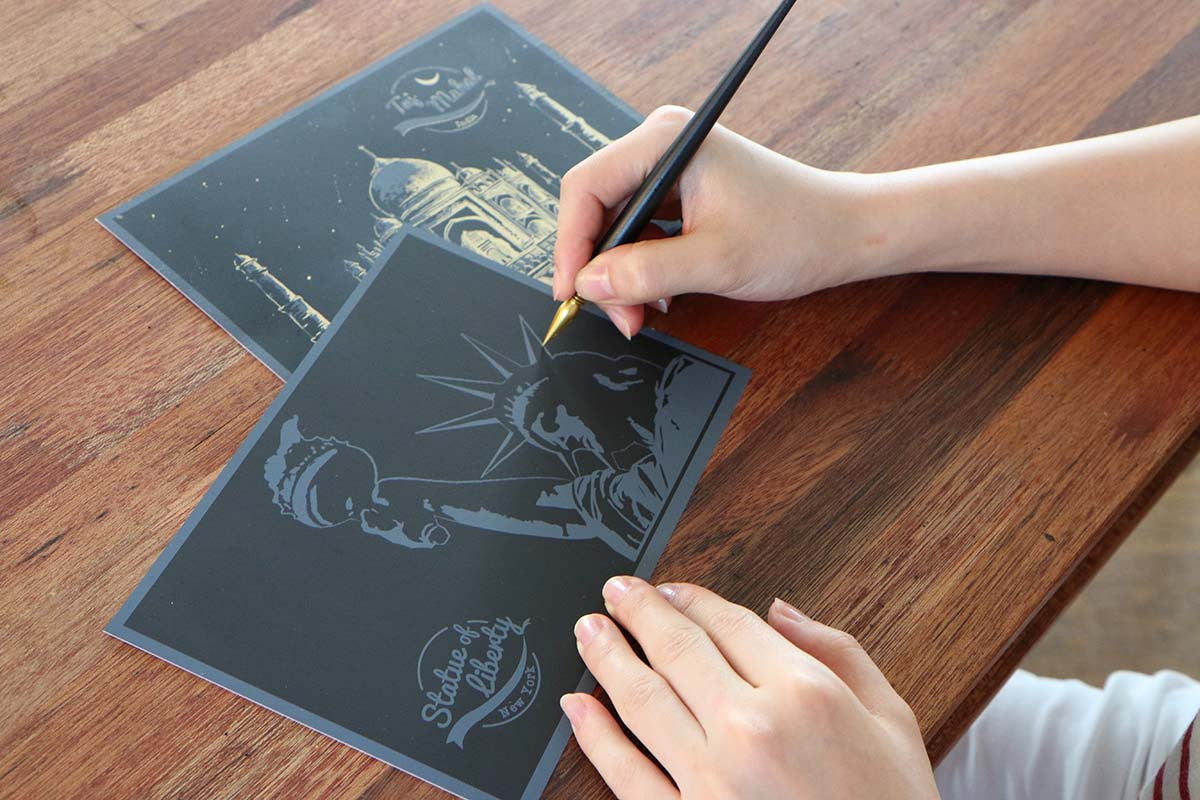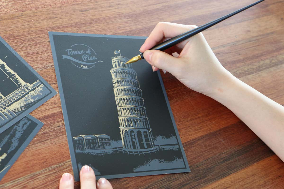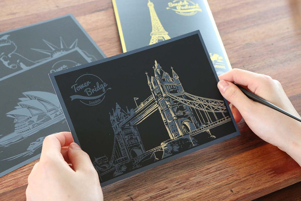 Contents: Postcards x 4 (Tower of Pisa, Opera House, Tower Bridge, Statue of Liberty) Tracing Paper Envelop x 1 Gold Seal Sticker x 1 Scratch Stick x 1