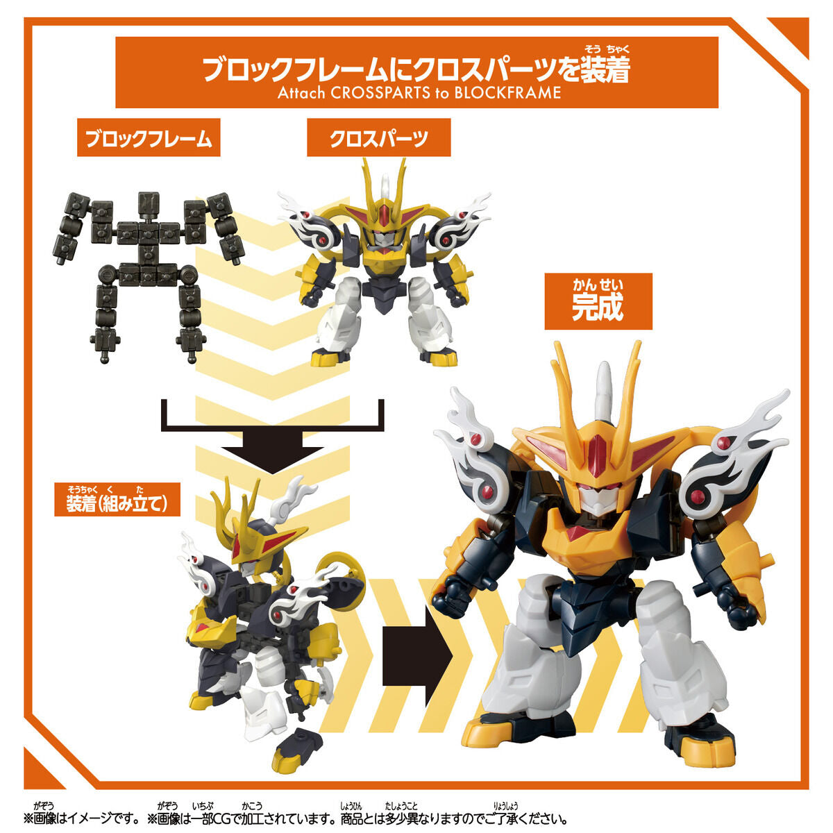 The figure is completed by simple assembly by attaching the cross parts to the block frame. You can enjoy attaching weapons to each Mashin.